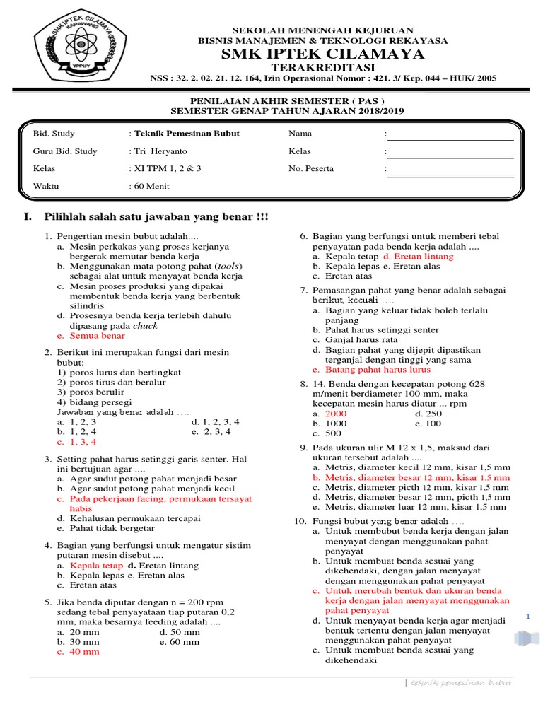 Soal Teknik Pemesinan Bubut Kelas 11 Beserta Jawabannya / 40 Latihan Soal Unbk Teori Kejuruan Teknik Pemesinan Beserta Kunci Jawaban Dan Pembahasanya Paket 2 Teknik Pemesinan - Soal pilihan ganda mesin bubut beserta jawabannya seputar mesin.
